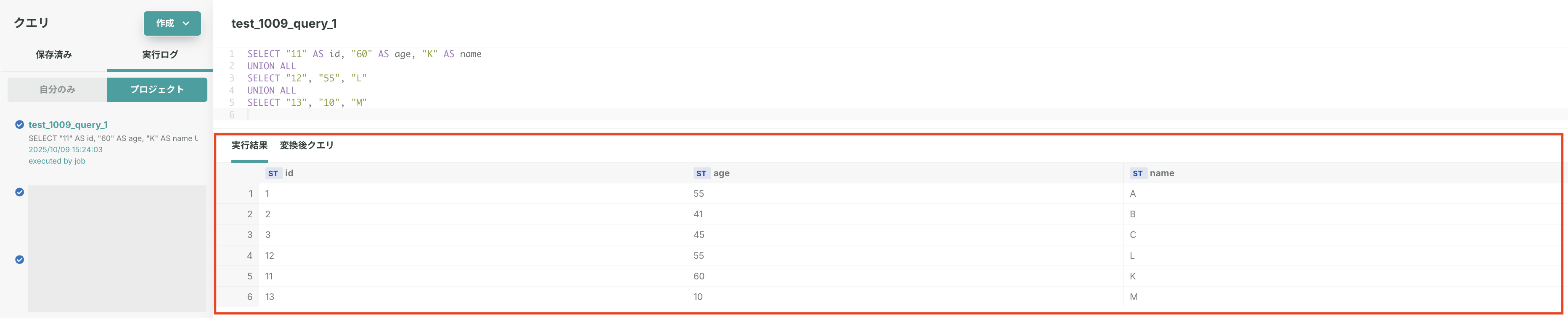 ジョブフローでクエリを自動実行した場合、実行ログにはクエリによって更新された後のデータが表示されます。 以下に具体例を示します。